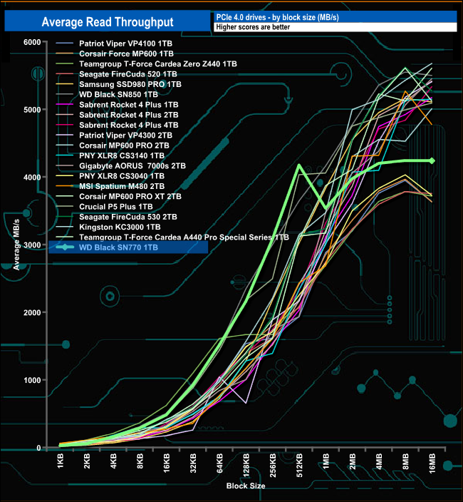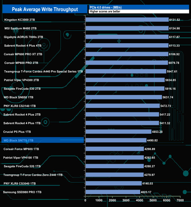 The peak read throughput test result of the Black SN770 sees it in the bottom half of our results chart.