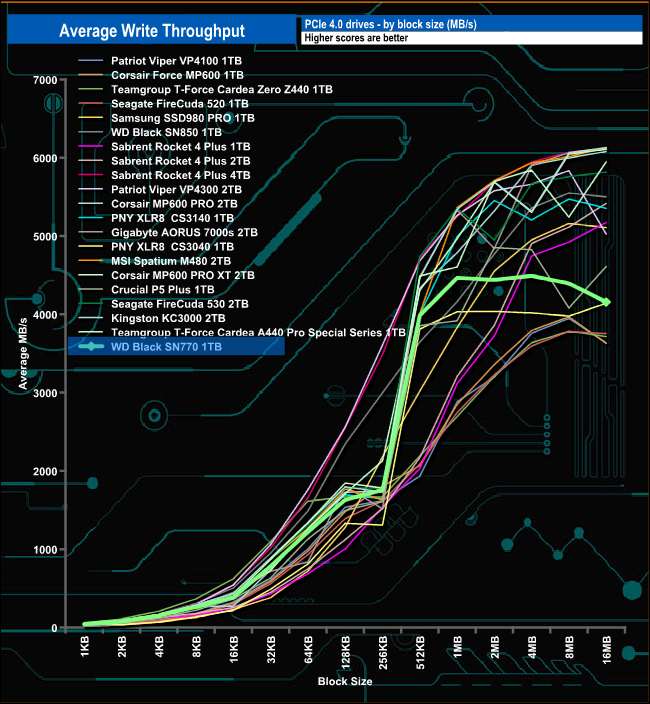 In our read throughput test, the 1TB Black SN770 peaked at 4,241.74MB/s at the 8MB block mark. That test result is some way off the official maximum of 5,150MB/s.