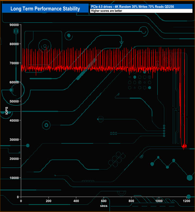For the long term performance stability test, we set the drive up to run a 20-minute 4K random test with a 30% write, 70% read split, at a Queue Depth of 256 over the entire disk. The 1TB WD Black SN770 averaged 67,223 IOPS for the test with a performance stability of 86%.