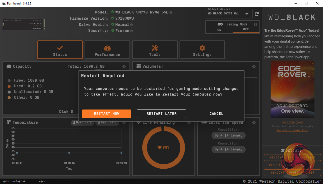 WD’s SSD management utility goes under the name of SSD Dashboard. With it, you can monitor drive status, performance, update firmware and monitor temperatures. There’s no cloning tool integrated into the utility but you can download Acronis True Image WD Edition from the WD website.