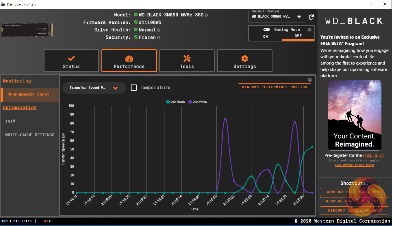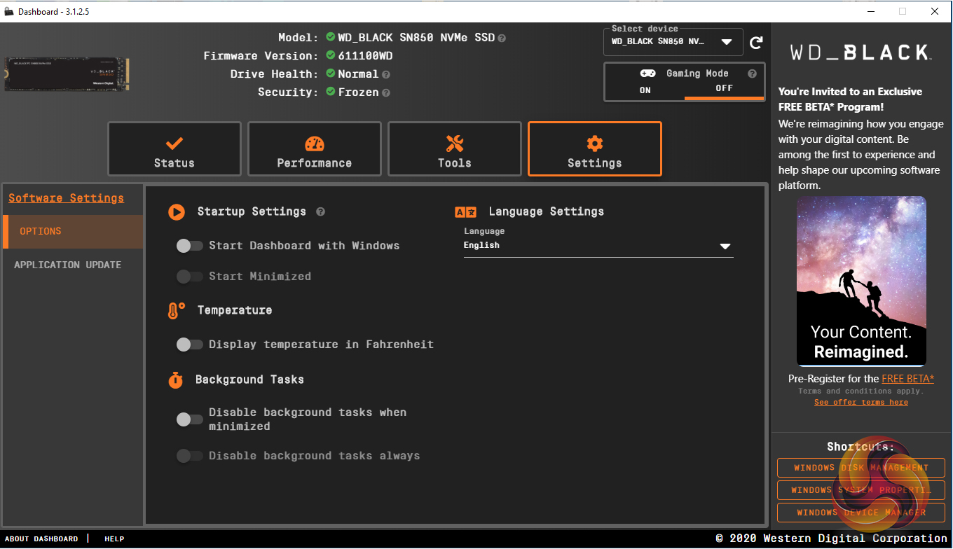 WD's SSD management utility goes by the name of Dashboard. Dashboard is pretty comprehensive and allows you to monitor drive status, performance, perform secure erases (currently only by making a bootable USB device), update firmware and monitor temperatures. It also includes a gaming mode which if enabled reduces latency by disabling the low power modes via the firmware.