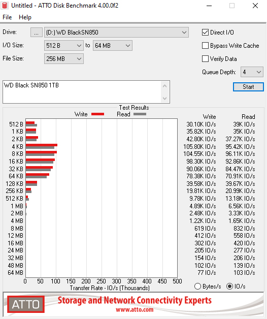 The 1TB Black SN850 is rated as up to 7,000MB/s for Sequential reads and up to 5,300MB/s for writes. Although we couldn't hit those maximums with the ATTO benchmark, the test results of 6,510MB/s for reads and 4,840MB/s for writes are the fastest we have seen to date for a PCIe Gen 4 drive.