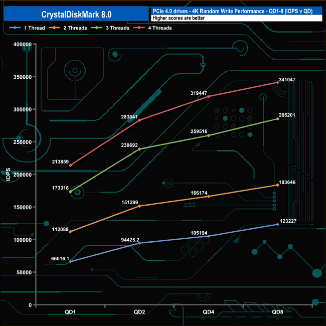 The 2TB WD Black SN850X write performance climbs very smoothly throughout the tested queue depths and threads with peak performance figures ranging from 123,227 IOPS (QD8) using a single thread up to 341,047 IOPS (QD8) using four threads.