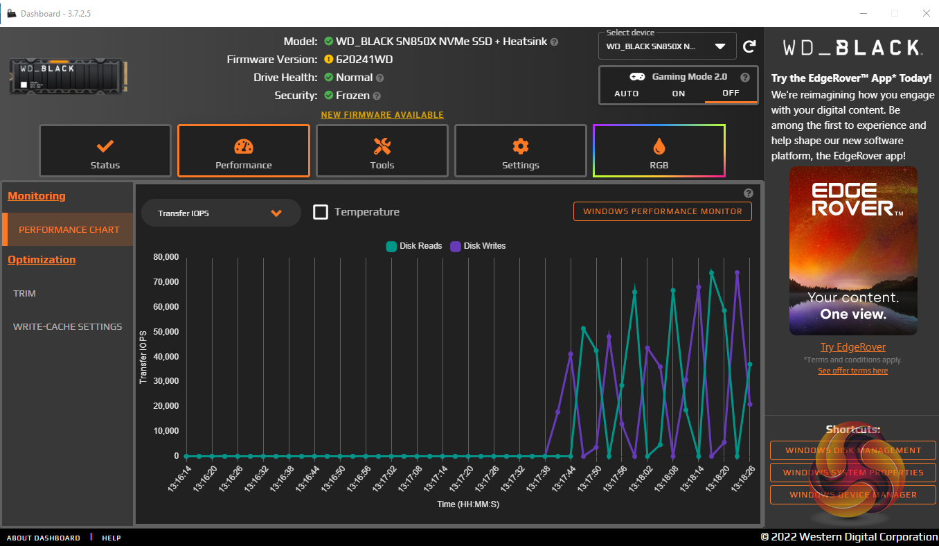 SSD Dashboard also lets you turn on/off WD's Game Mode 2.0 which is only available for Windows currently. The latest version of Game Mode includes an auto mode. When this is selected the system detects game launches and will turn gaming features on; load prediction for faster in-game loading, disabled power saving and adaptive thermal management.