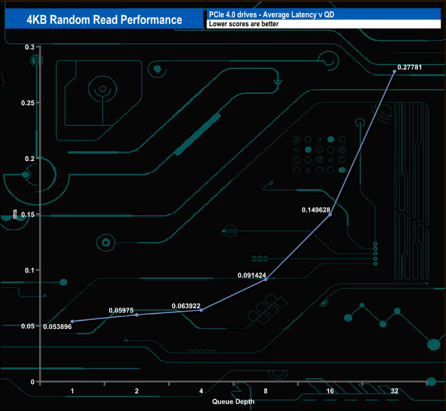 We used CrystalDiskMark 8‘s custom settings to test the 4K random read performance of the drive through a range of queue depths. The setup for the tests is listed below.