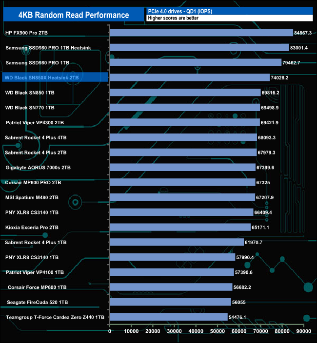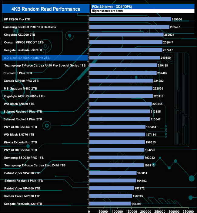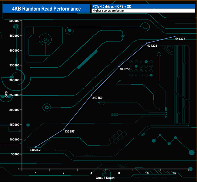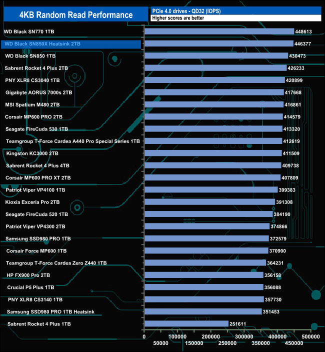 At QDs 1, 2 & 4 the drive hovers around the top five of the drives we've tested to date. However at QD32, the 446,377 IOPS figure from the drive sees it in second place in the chart behind another WD Black drive, the SN770.