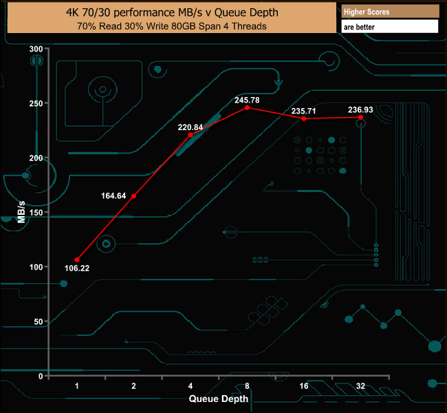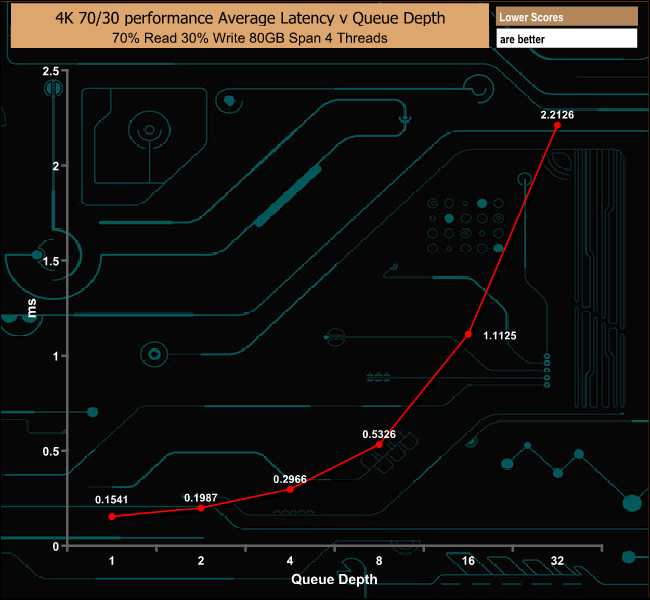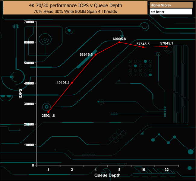 WD's Blue SN500 makes a decent fist of our 70/30 read/write mix test, peaking at 60,005 IOPS at a queue depth of 8.