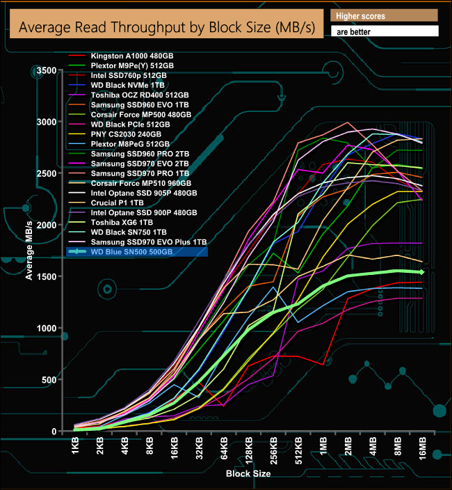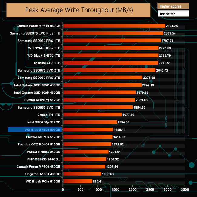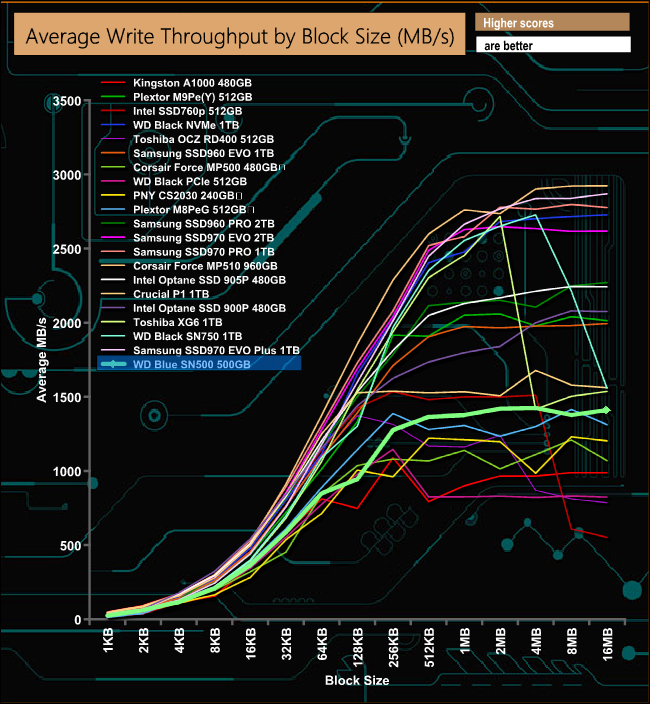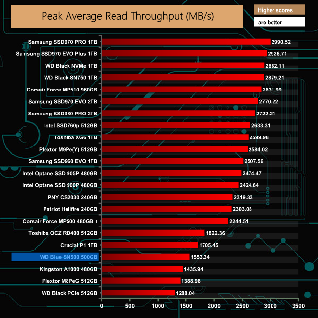 In our read throughput test, the WD Blue SN500 peaked at 1,553MB/s at the 8MB block mark.