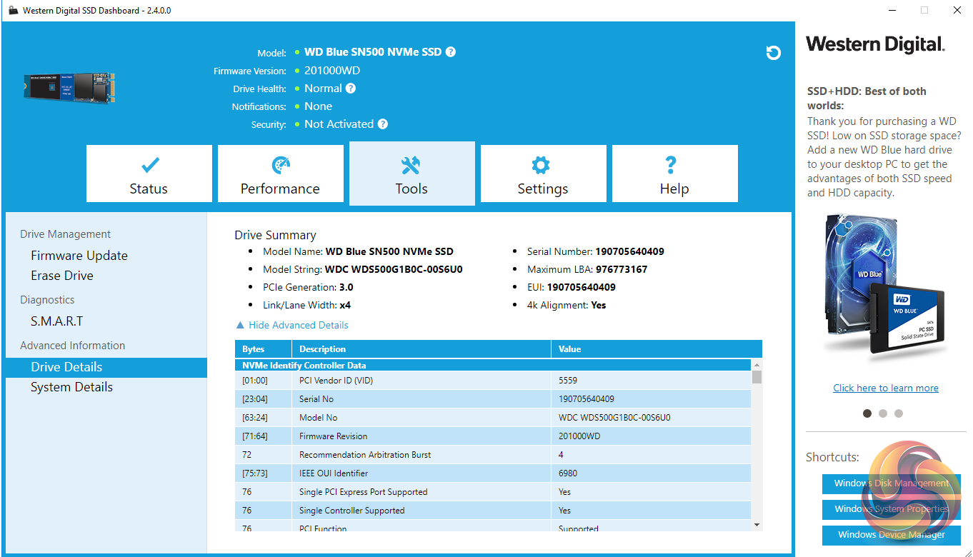 WD’s SSD management software goes by the name of SSD Dashboard, though it's not the new fancy version that supports the latest Black NVMe drive range of drives, it's the plainer-looking standard version. With it you can monitor drive status, performance, secure erase (currently only by making a bootable USB device), update firmware and monitor temperatures. There’s no cloning tool integrated into the utility but you can download Acronis True Image WD Edition from the WD website.