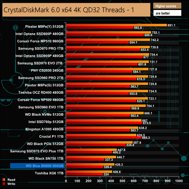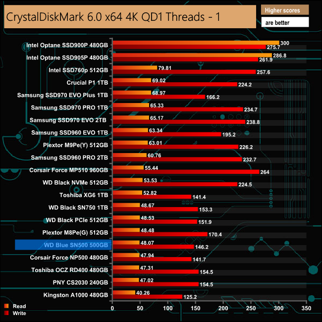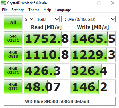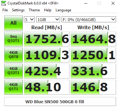 The Blue SN500 struggles with the CrystalDiskMark 4K tests at the deep queue depth of 32, which isn't really a surprise for an entry-level drive. At a QD of 1, which is more representative of everyday use, the drive performs quite well compared to its competitors. Looking at the two benchmark result screens, it seems the WD controller doesn't favour any type of data over another.