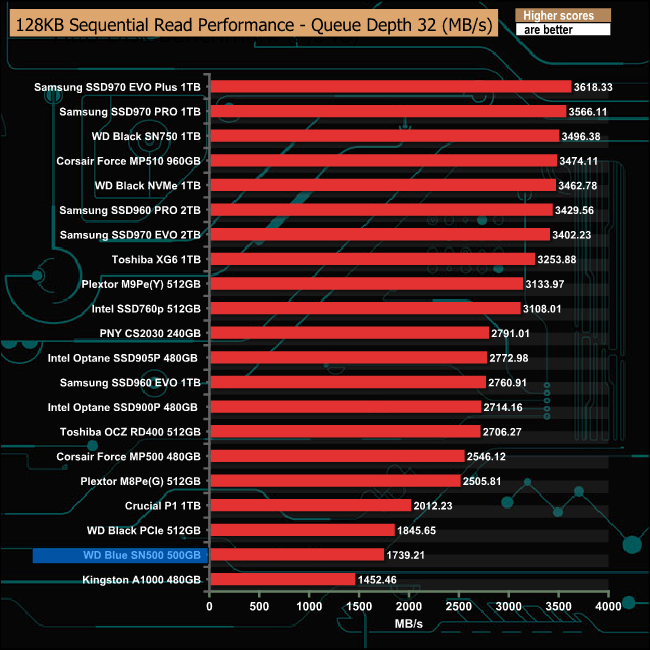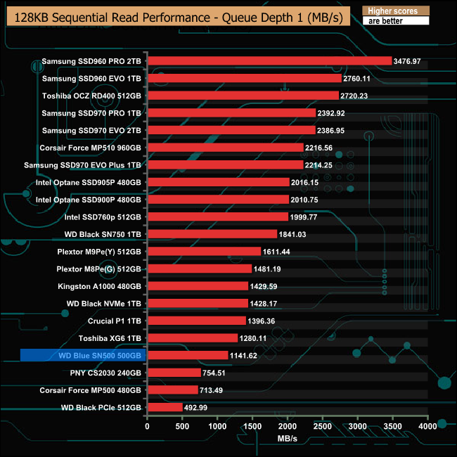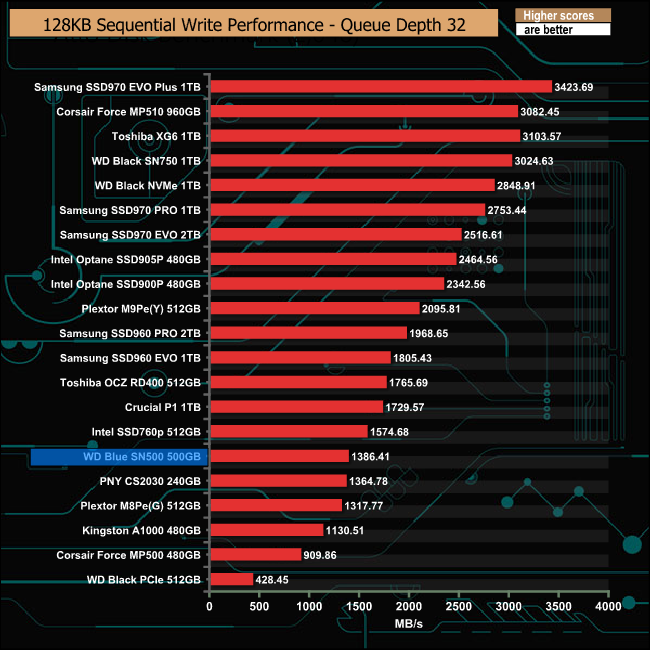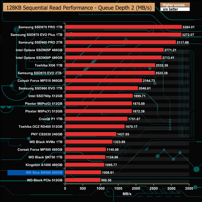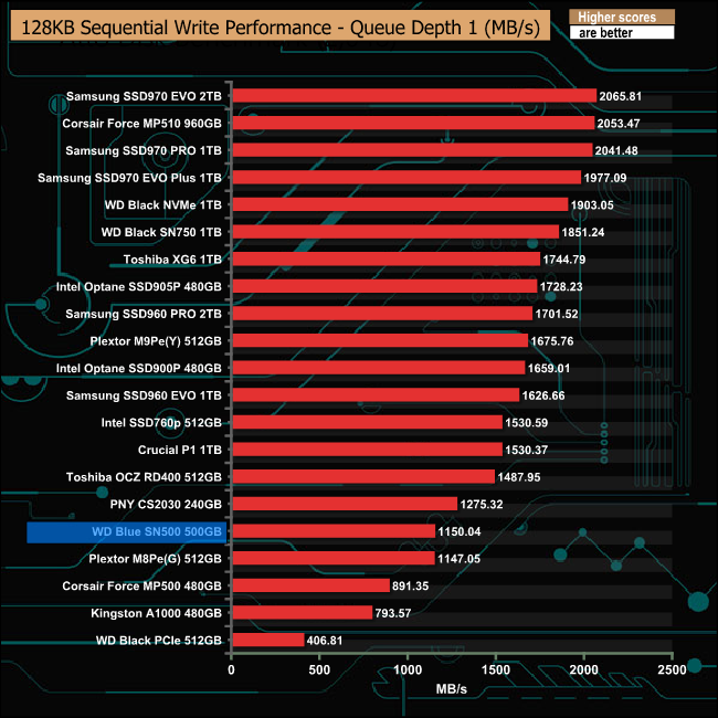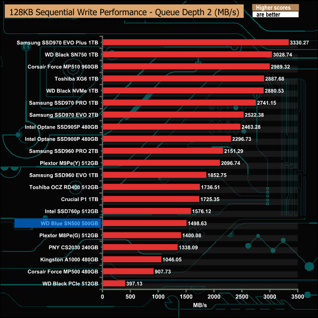 When it comes to Sequential writes the Blue SN500 holds its own against many of its market segment competitors at all the tested queue depths.