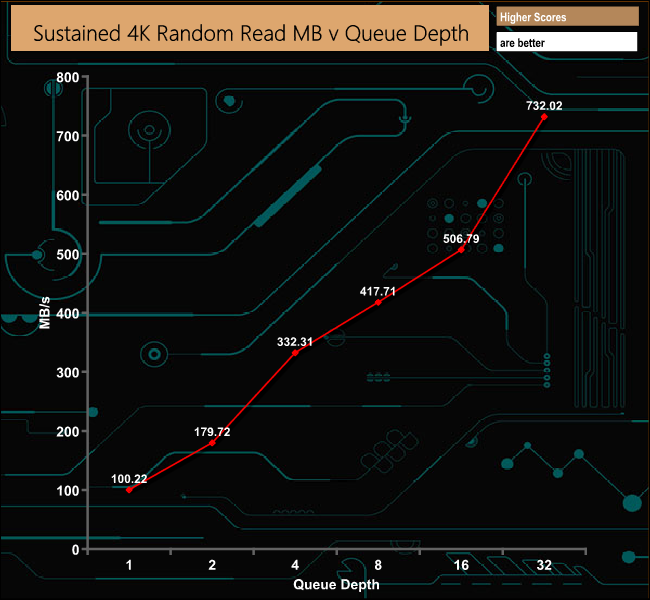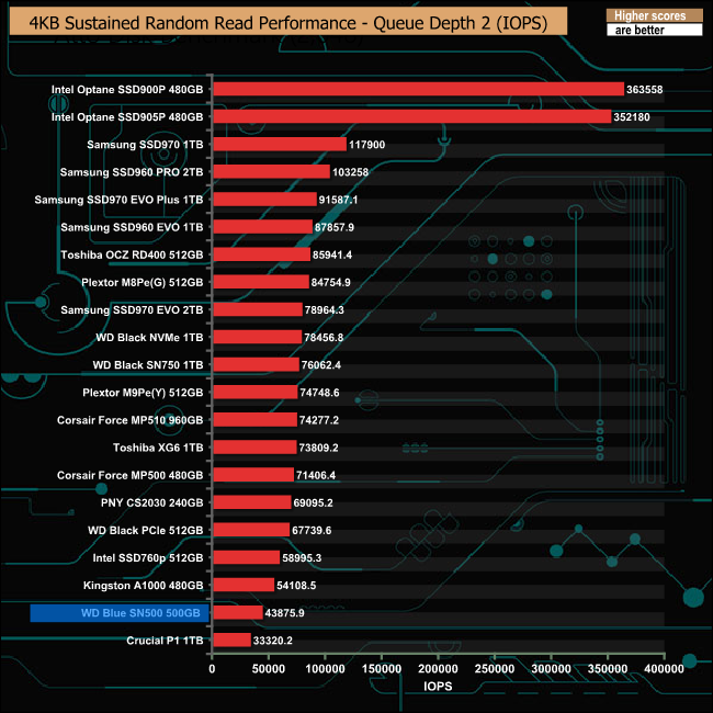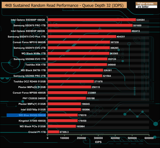 The maximum 4K random read figure quoted by WD for the 500GB Blue SN500 is 275,000 IOPS at a Queue Depth of 32 with just a single thread. The review drive produced a tested figure of 176,518 IOPS at QD32 with four threads.