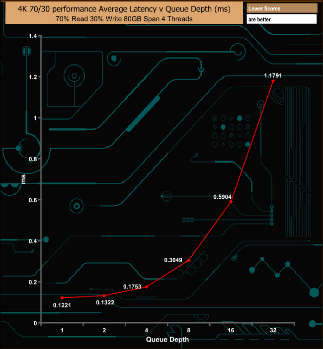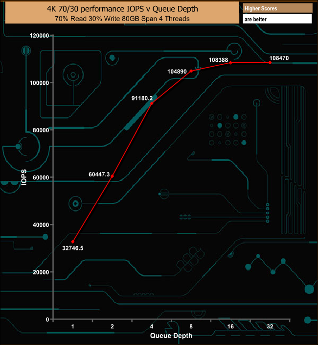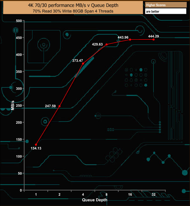 The WD Blue SN550 performs well in the 4K 70/30 mixed read/write test, peaking at 108,470 IOPS (444.29MB/s).