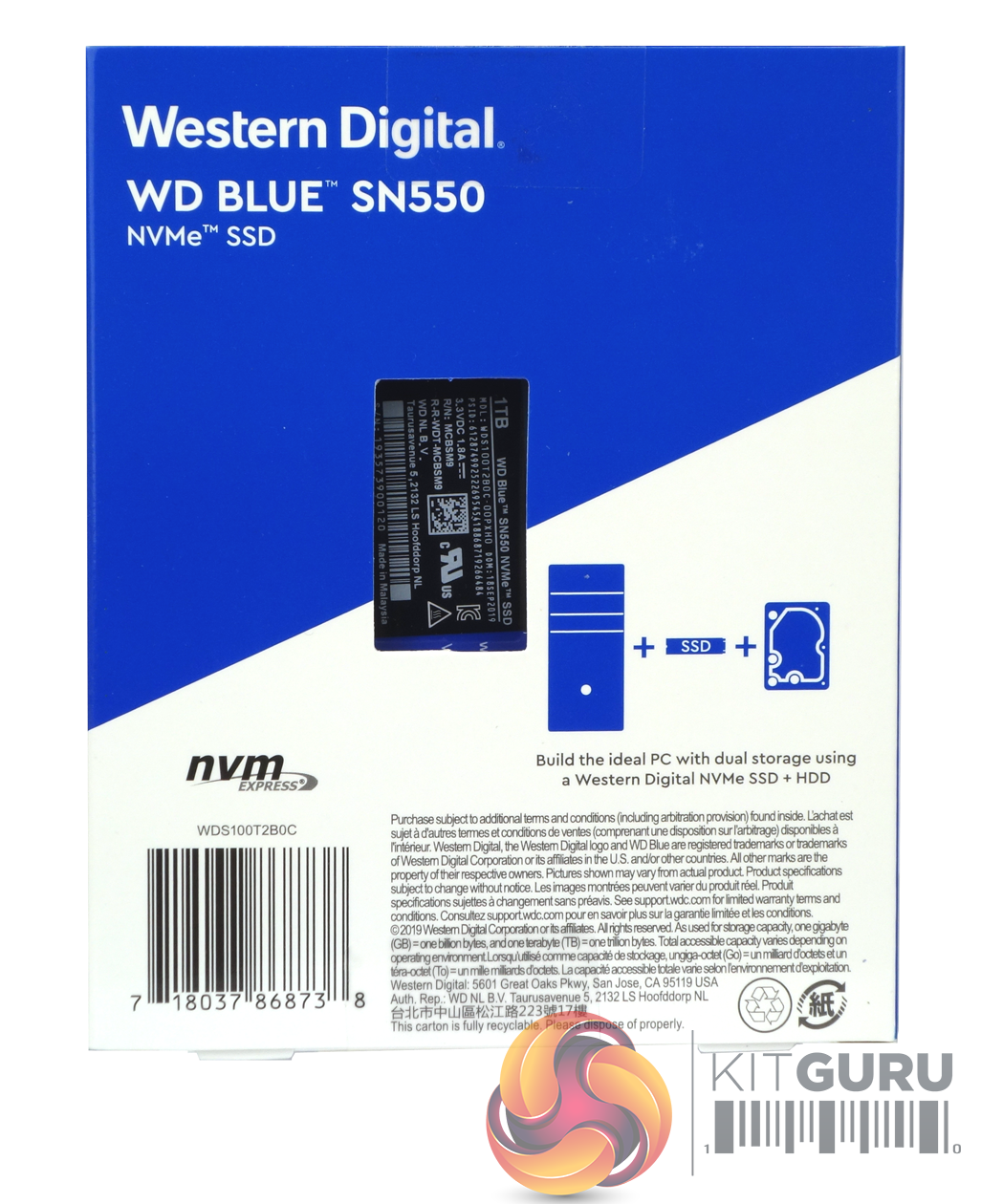 The WD Blue SN550 comes in a smallish box with a clear image of the drive on the front. In the bottom left corner of the box, the 2,400MB/s Sequential read figure is highlighted. Next to this are three boxes displaying the capacity of the drive (in this case 1TB), the fact it uses 3D NAND and that it comes with a 5-year warranty.