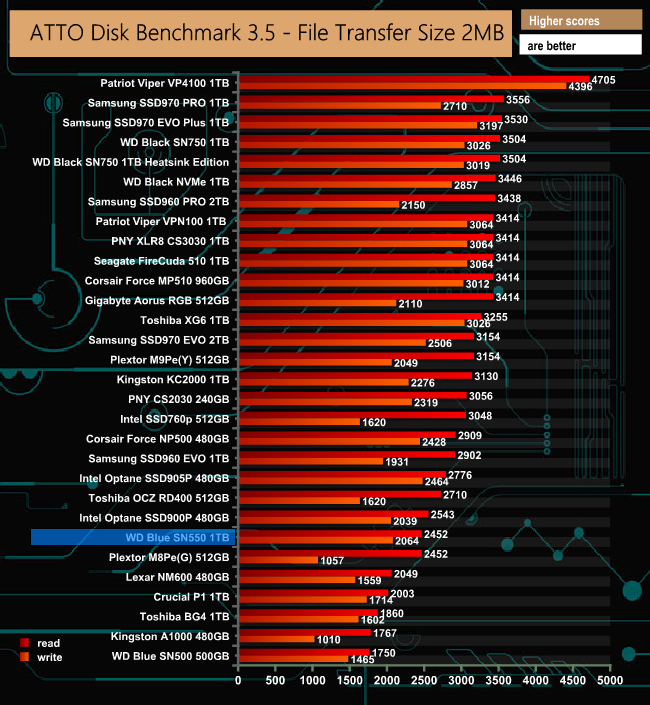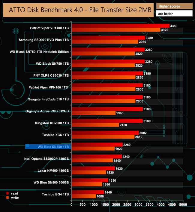 The drive scores slightly lower in the 4.0 version of ATTO with reads at 2,280MB/s and writes at 1,920MB/s.