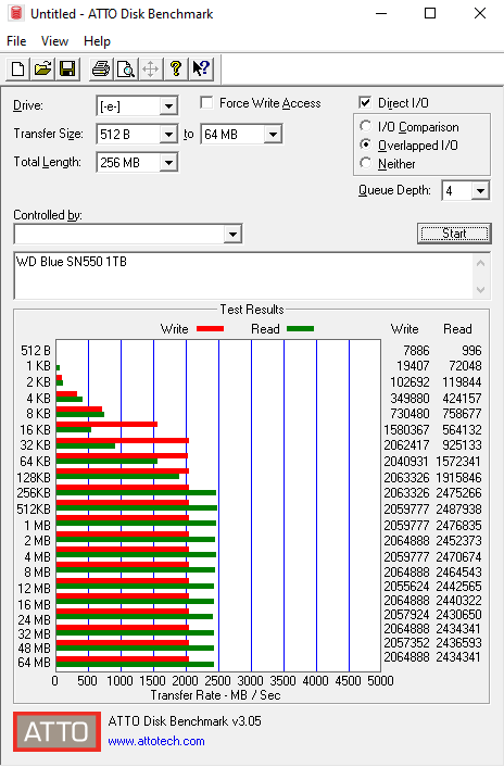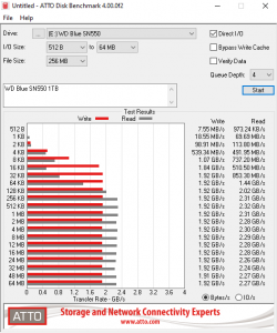 The official Sequential read/write figures for the drive are up to 2,400MB/s for reads and up to 1,950MB/s for writes, both figures we can confirm using the ATTO benchmark with the review drive producing read/write figures of 2,452MB/s and 2,064MB/s respectively when tested.
