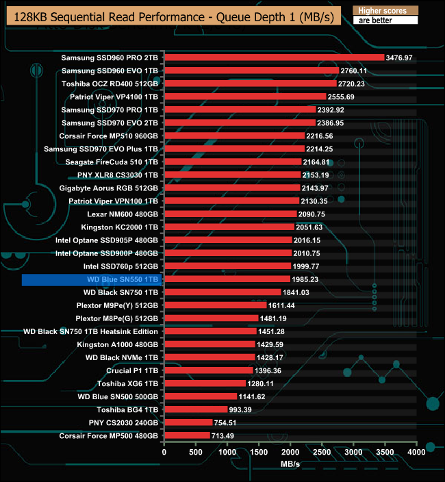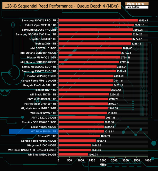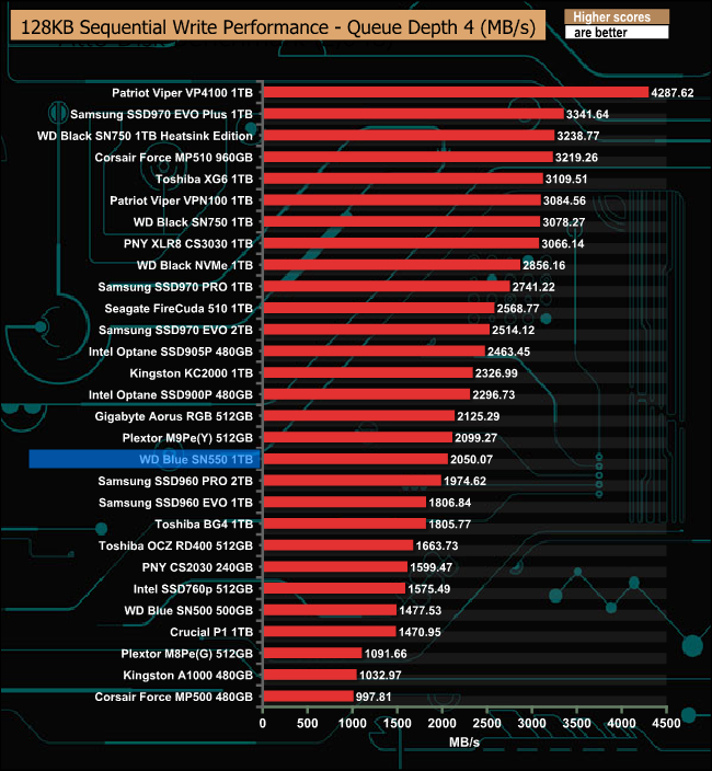 At a QD of 1, the SN550 shows very strong performance not only compared to the previous SN500 but to both SN750 Black drives, However as the QD deepens the two Black model drives pull away from the SN550 but it still remains much faster than the older SN500 thanks to its PCIe x4 interface and 96-layer NAND.