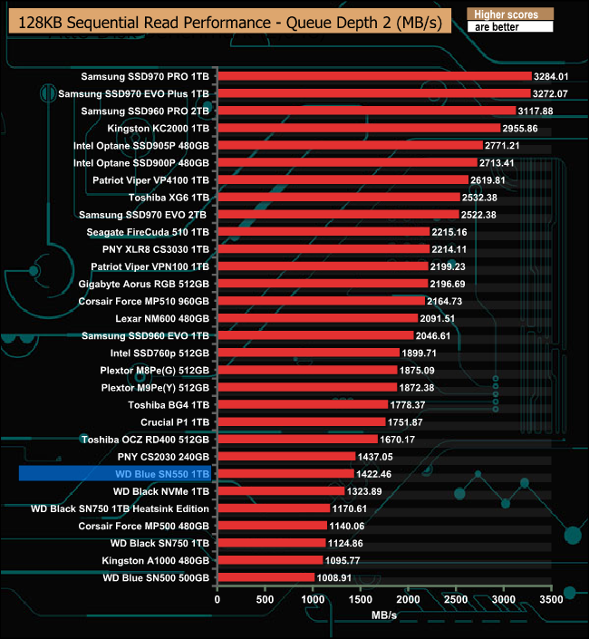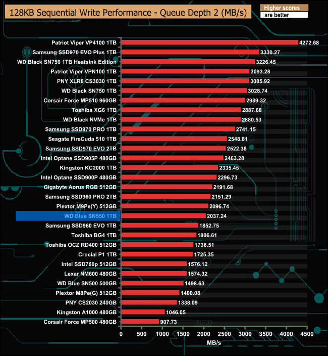 At Queue Depth's 1 and 2, the WD Blue SN550 is not only much faster than the previous SN500 drive, it is also faster than both versions of the WD Black SN750 we've tested. However, at a QD of 32, the SN550 as you might expect drops back compared to the two Black SN750 drives.