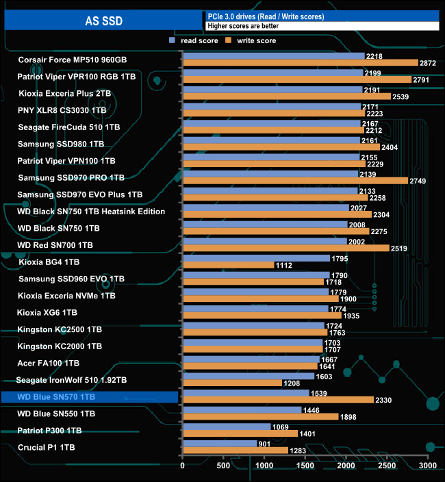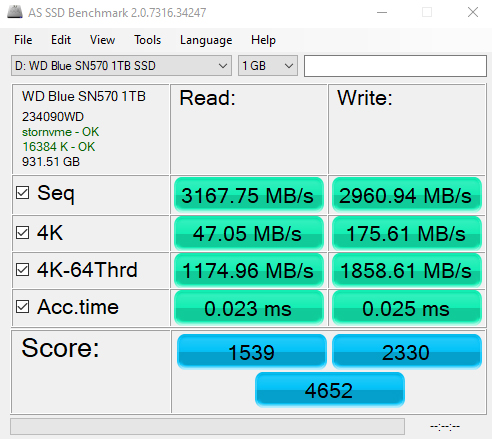 The WD Blue SN570 doesn't fare that well in the demanding AS SSD benchmark but it does perform better than the previous WD Blue SN550 for both reads and writes.