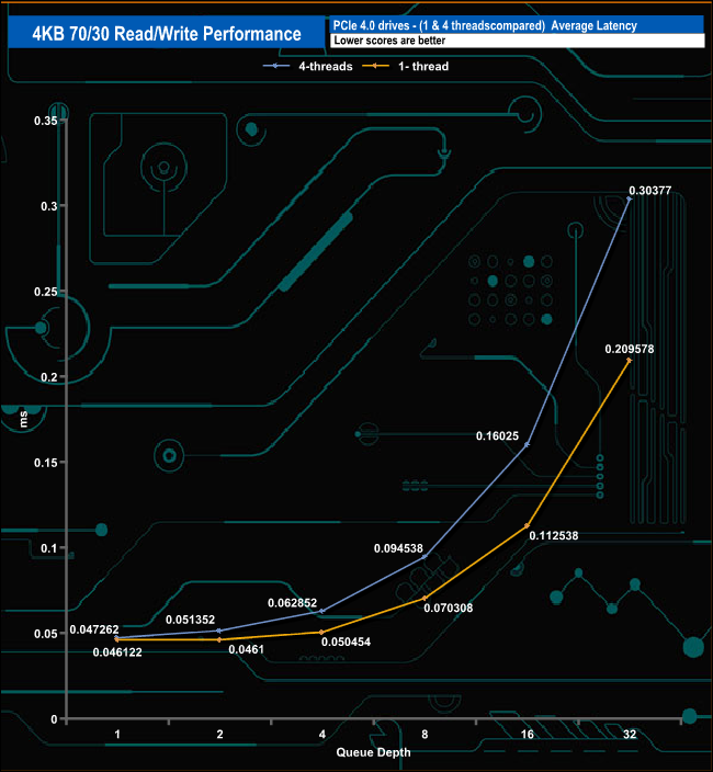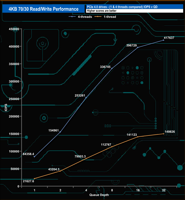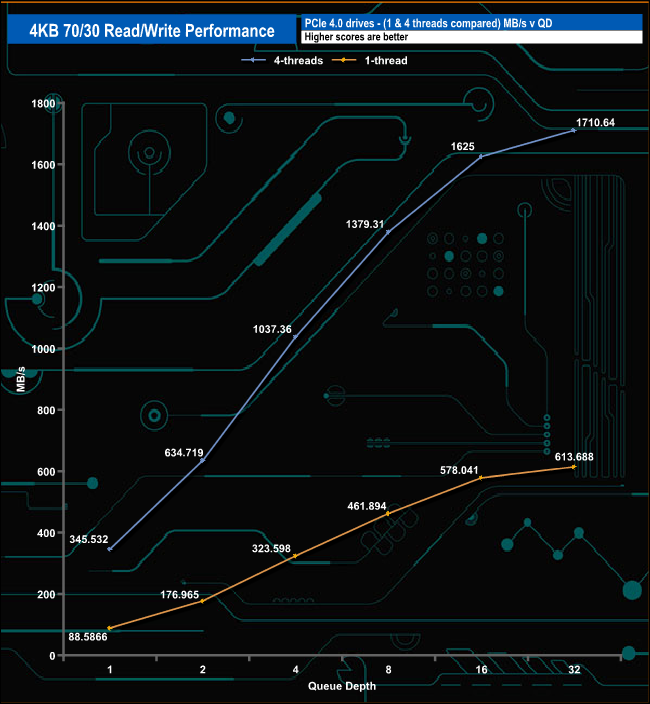 We used CrystalDiskMark 8’s custom settings to test the 4K 70/30 mixed read/write performance of the drive through a range of queue depths.