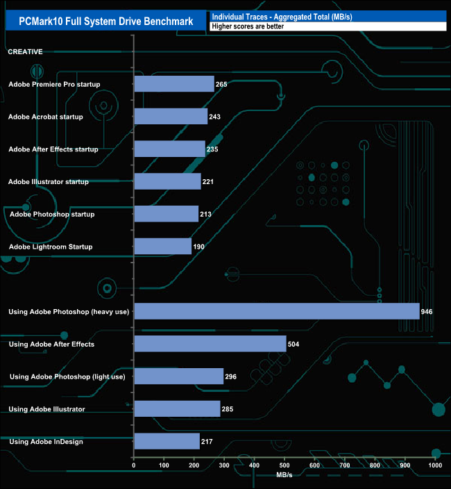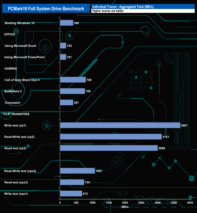 The PCMark 10 Full System Drive Benchmark uses a wide-ranging set of real-world traces from popular applications and common tasks to fully test the performance of the fastest modern drives. The benchmark is designed to measure the performance of fast system drives using the SATA bus at the low end and devices connected via PCI Express at the high end.