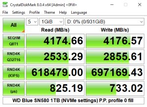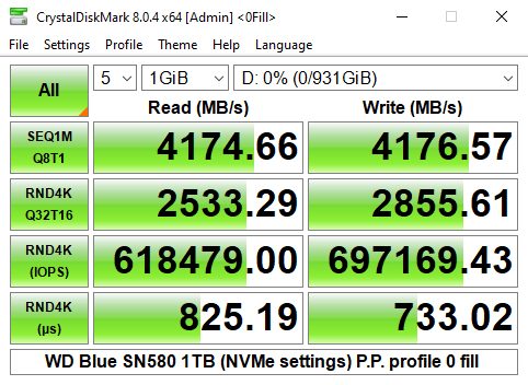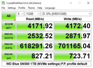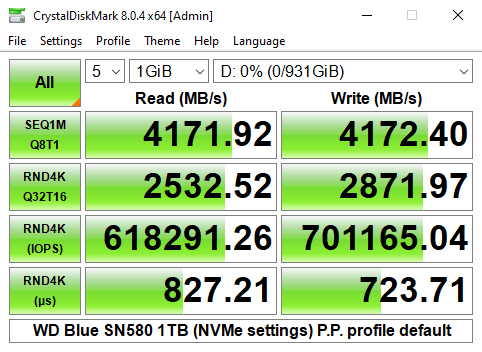 Looking at the two benchmark screens, it's clear that the in-house WD controller doesn't really have a preference for the type of data it's being asked to handle. We could also confirm the official Sequential performance figures for the drive; up to 4150MB/s for both reads and writes with test scores of 4,171MB/s for reads and 4,172MB/s for writes.