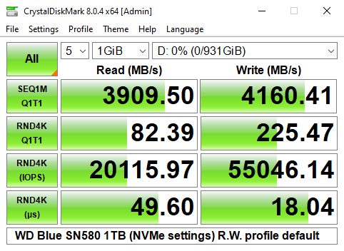 In the CrystalDiskMark 4K QD1 T1 test, the Blue SN580 does pretty well, with a 82.4MB/s read score with writes at 226.64MB/s, good enough to see it in sixth place in the results chart. It's also an improvement on the previous generation SN570 which scored 68.45MB/s and 200.67MB/s (read/writes respectively) for the same test.