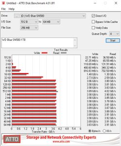 In the ATTO benchmark, the drive peaks at the 512KB mark at 4,020MB/s for reads, still short of the official maximum of 4,150MB/s before dropping back to 3,180MB/s at the 8MB mark. When it came to write performance the drive peaked at the 128KB mark at 3,900MB/s and pretty much stayed at that level for the rest of the test run.