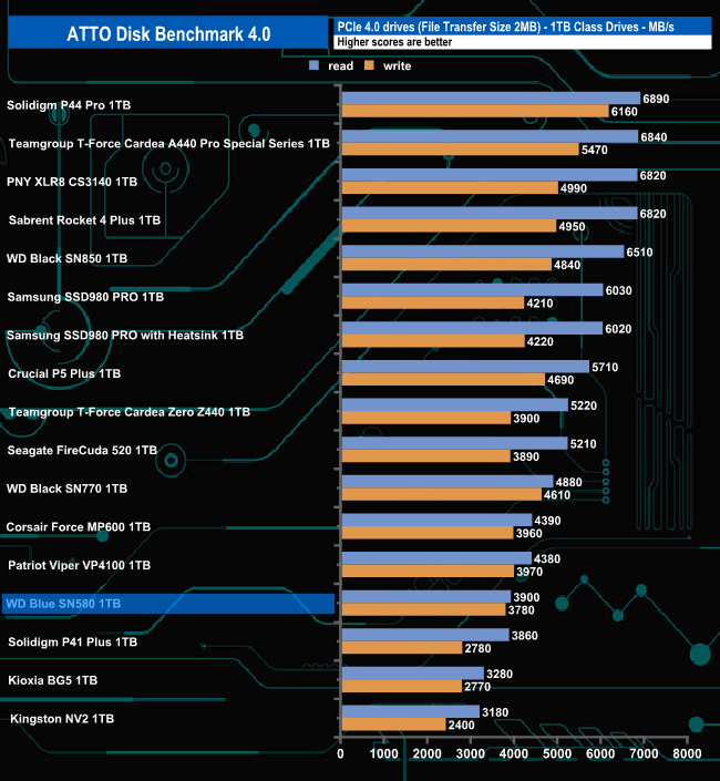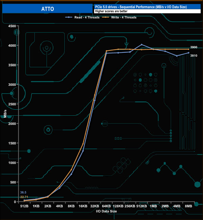 With the ATTO benchmark, we couldn't quite hit the official maximum Sequential ratings of 4,150MB/s for both reads and writes with best test results of 3,900MB/s and 3,780MB/s for read and writes respectively.