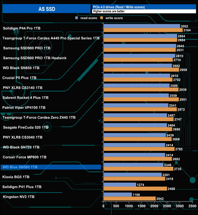 Although the read score of 2346 in the AS SSD benchmark sees the SN580 near the bottom of the results chart, its write result of 2735 is pretty strong. Both scores are an improvement over the previous generation SN570 which scored 1539 and 2330 for reads and writes respectively.