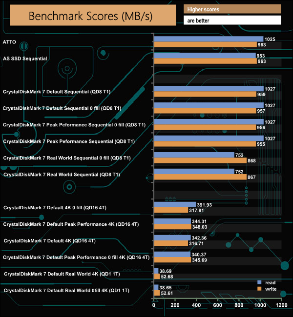 Officially the drive is rated as up to 1,050MB/s for reads and up to 1,000MB/s for writes. Under testing, we couldn't quite hit these maximums but we got the closest with ATTO (1,025MB/s read 963MB/s write) and the default CrystalDiskMark 7 test (1,027MB/s read, 959MB/s write).