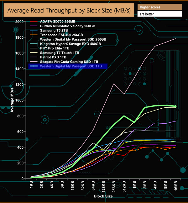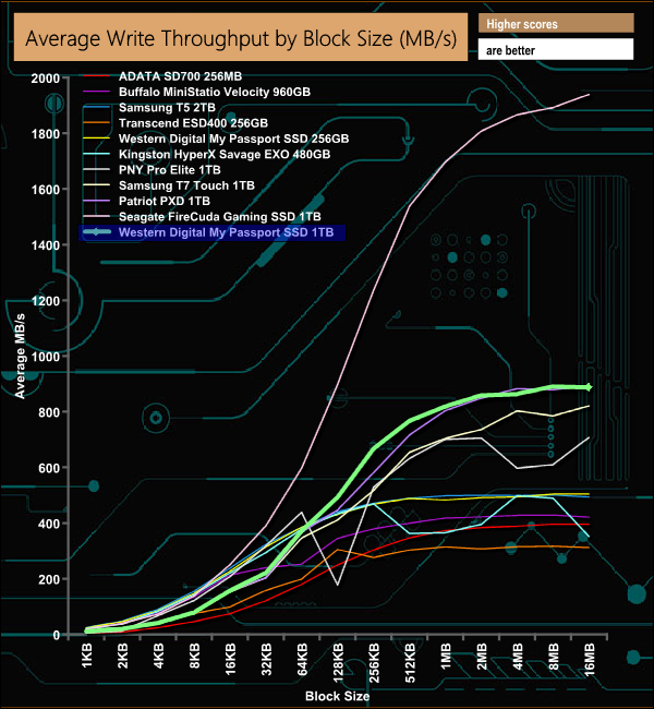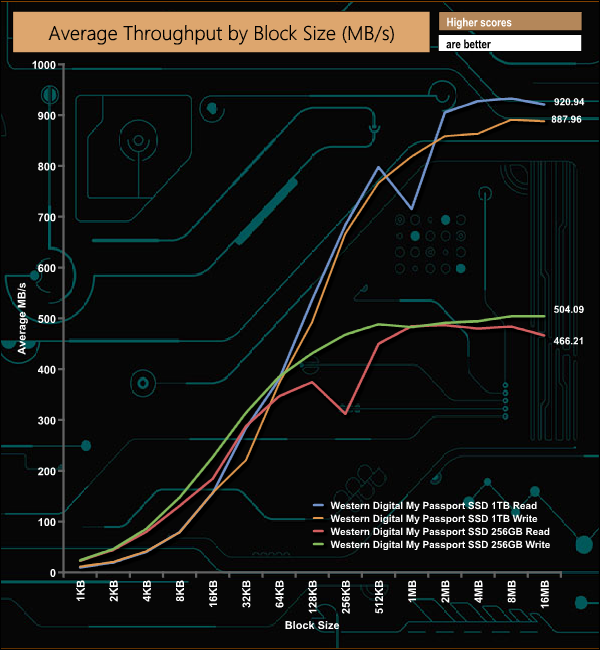 In our throughput tests, we couldn't quite get to the official maximum read/write figures of 1,050MBs and 1,000MB/s respectively but at 920MB/s we were much nearer the official read figure than the write (887MB/s). Comparing the latest My Passport SSD to the first generation drive shows the huge performance gain by using an NVMe SSD / USB 3.2 Gen 2 combination over the SATA III M.2 / USB 3.1 based original drive.