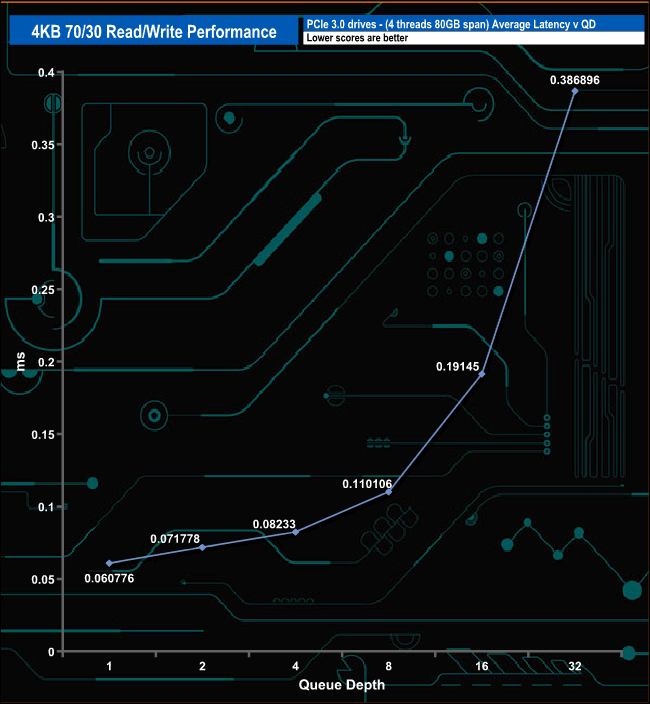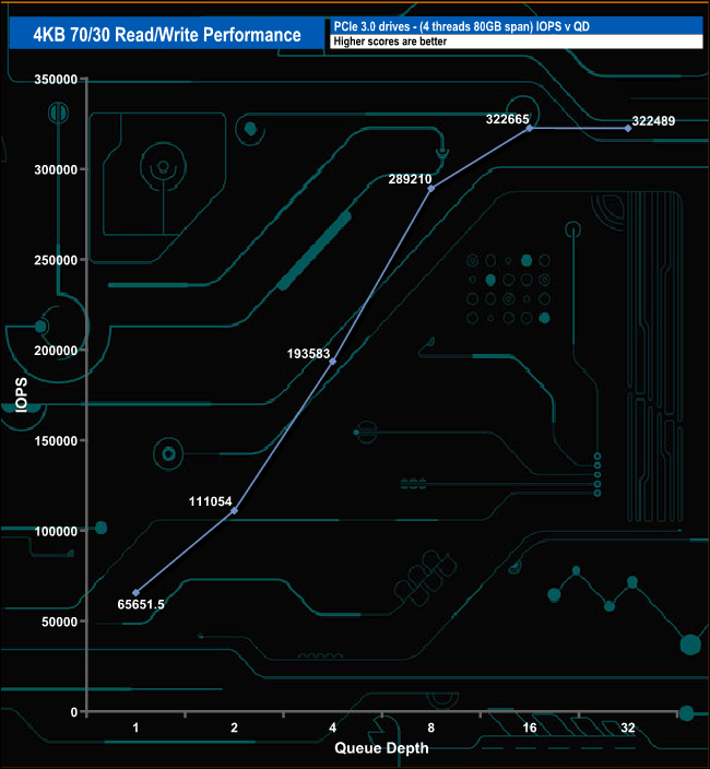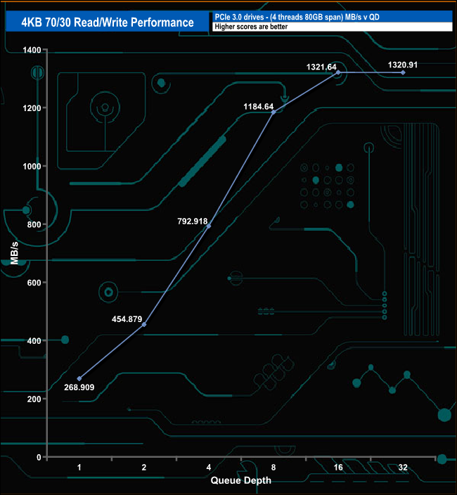 We tested the 4K 70/30 mixed read/write performance of the drive through a range of queue depths.