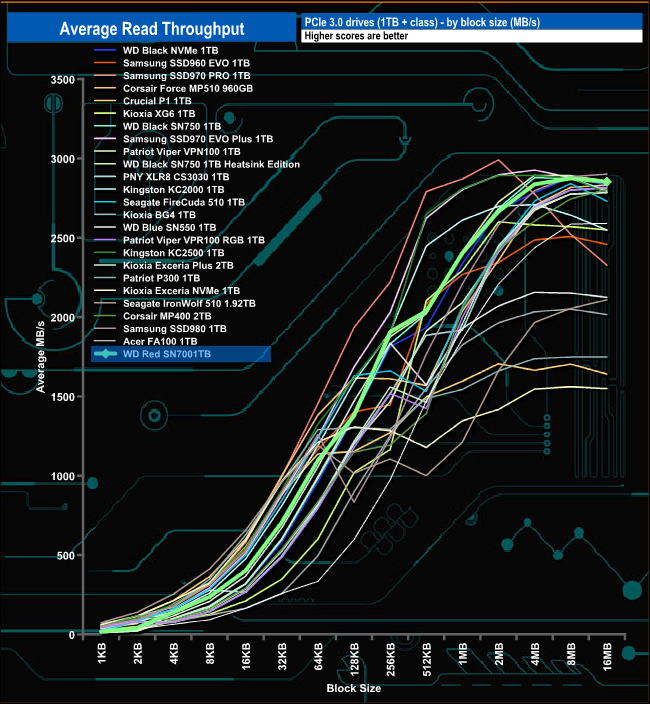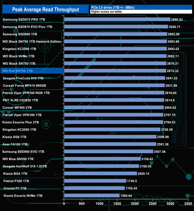The drives read throughput score of 2,874.32MB/s sees it in the top 10 of the results chart.