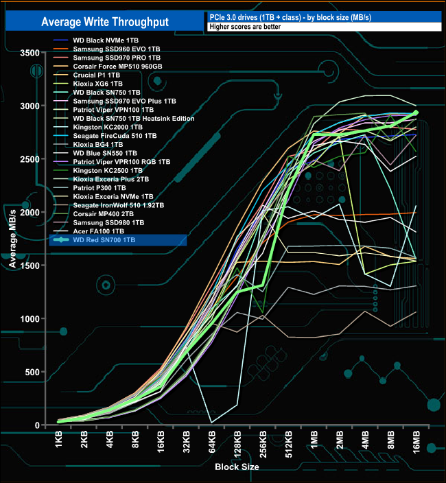 The WD Red SN700's write peak throughput test result of 2,934.11MB/s came at the end of the test at the 16MB block mark.