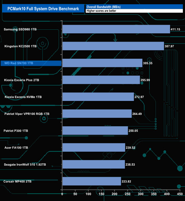 Overall the WD Red SN700 performs well in PCMark10’s Full System Drive benchmark with an overall bandwidth score of 305.352MB/s.
