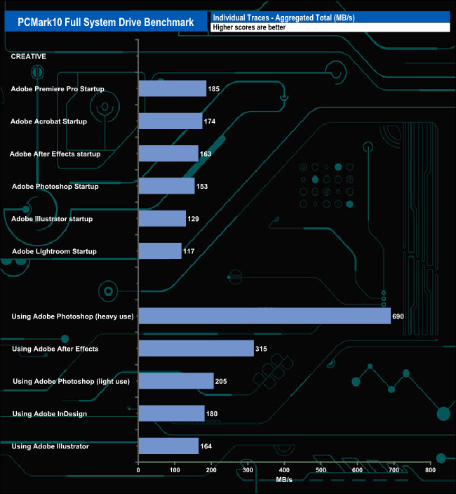 WD's Red SN700 handled PCMark10’s Full System Drive benchmark pretty well. The drive averaged 153.50MB/s for the six Adobe startup tests and 310.800MB/s for the five Adobe usage test traces. The best individual score was 690MB/s for the heavy use Adobe Photoshop trace.