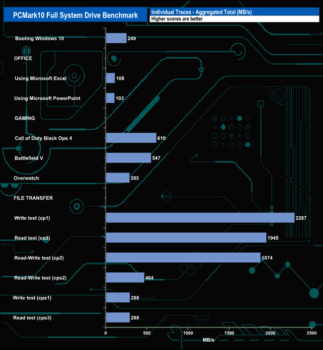 The PCMark 10 Full System Drive Benchmark uses a wide-ranging set of real-world traces from popular applications and common tasks to fully test the performance of the fastest modern drives. The benchmark is designed to measure the performance of fast system drives using the SATA bus at the low end and devices connected via PCI Express at the high end.