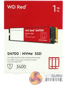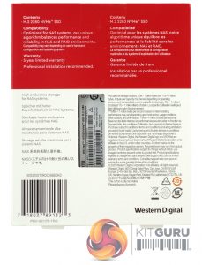 The WD Red SN700 comes in a smallish box with a clear image of the drive on the front. Under the image is a line of text highlighting the fact that the drive is built for NAS caching and storage duties. The 3,400MB/s Sequential read figure is displayed under this along with an icon displaying the fact that the drive is supported by a 5-year warranty.