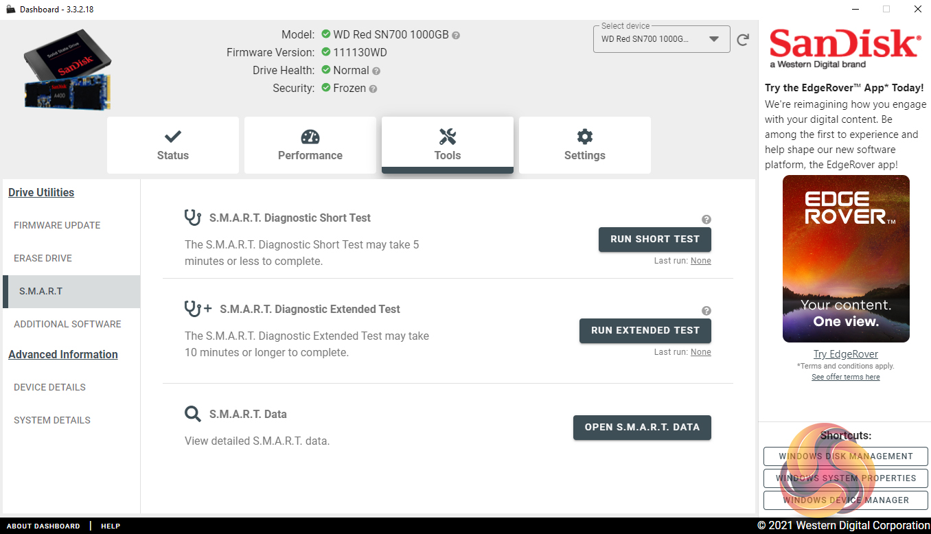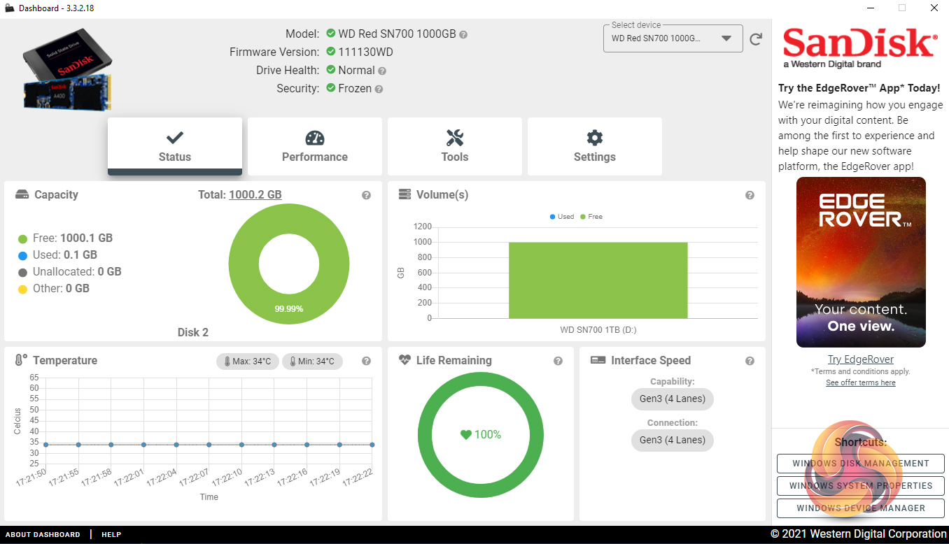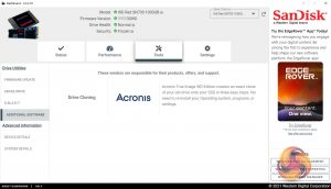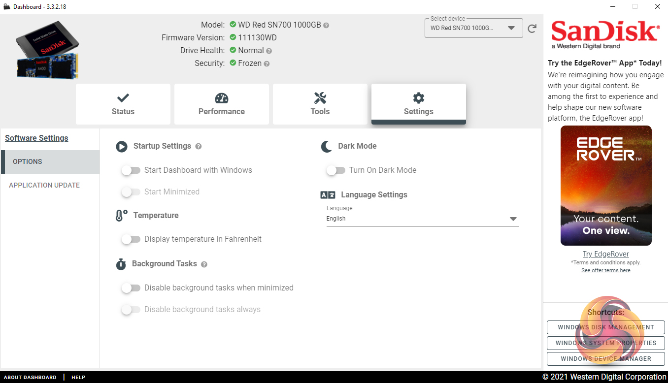 WD’s SSD management utility goes under the name of SSD Dashboard. With it, you can monitor drive status, performance, update firmware and monitor temperatures. There’s no cloning tool integrated into the utility but you can download Acronis True Image WD Edition from the WD website. There is also an option to change the layout to a dark mode.