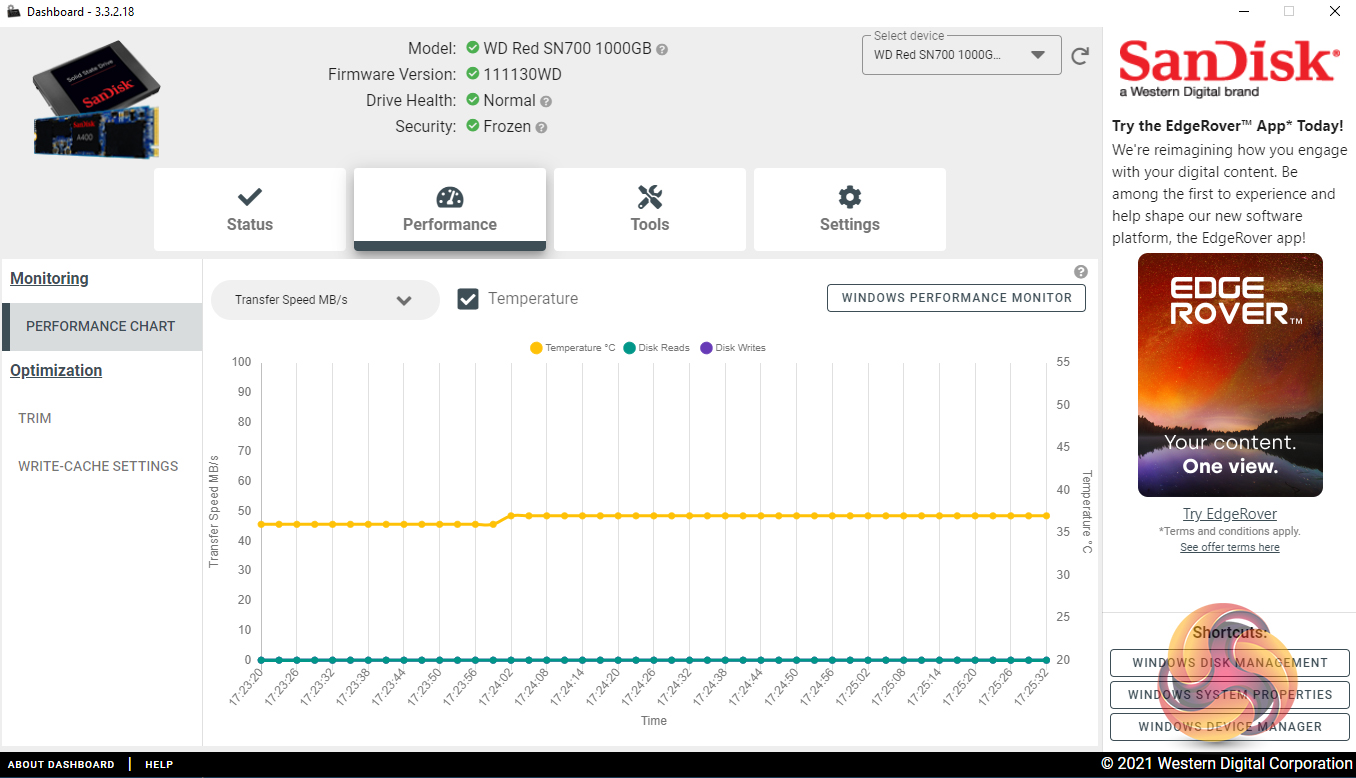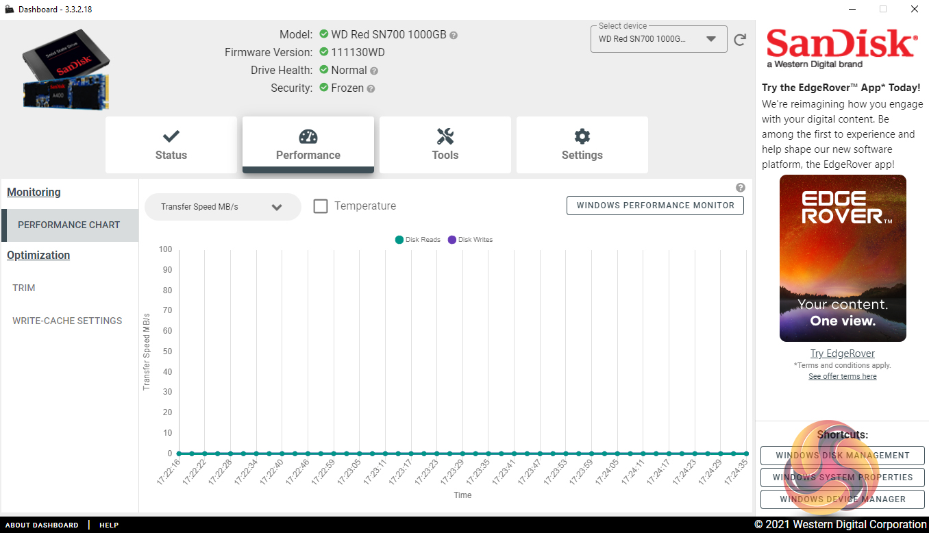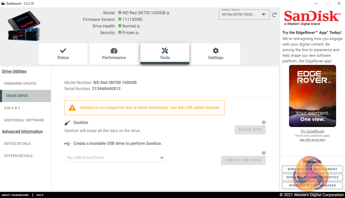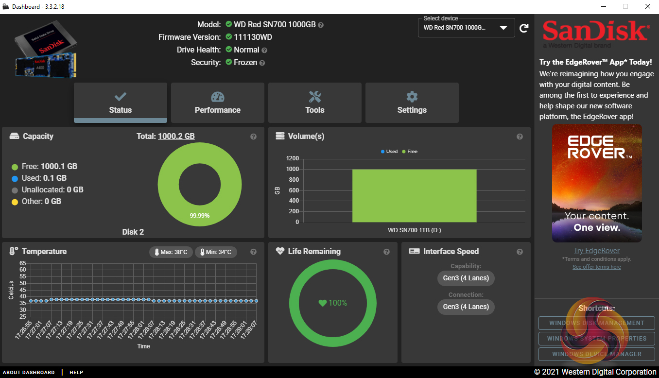 WD’s SSD management utility goes under the name of SSD Dashboard. With it, you can monitor drive status, performance, update firmware and monitor temperatures. There’s no cloning tool integrated into the utility but you can download Acronis True Image WD Edition from the WD website. There is also an option to change the layout to a dark mode.