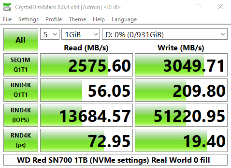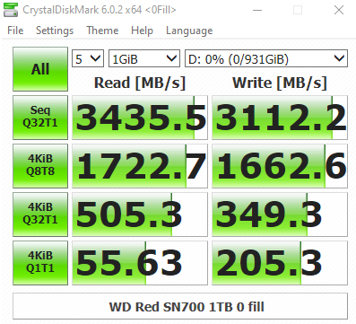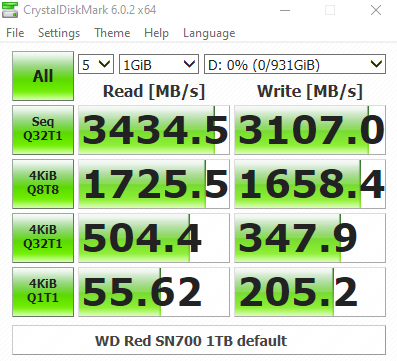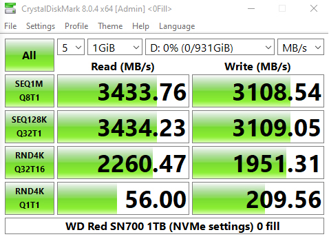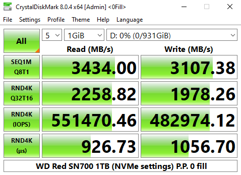 The WD Red SN700 sits in a mid-table position in our results chart for CrystalDiskMark's QD32 1 Thread test with a read result of 504.4MB/s and a write figure of 347.9MB/s. Looking at the two benchmark result screens we can see that the in-house WD controller isn't bothered about what type of data it is being asked to handle.