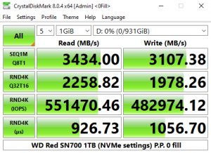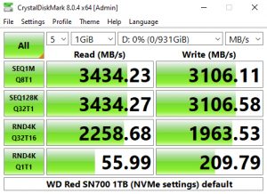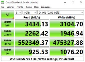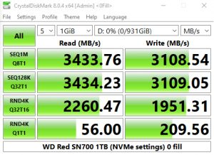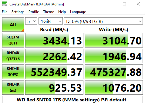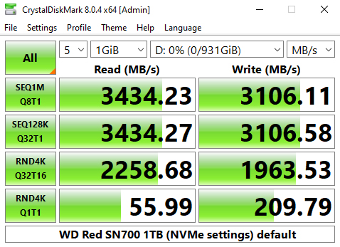 CrystalDiskMark 8 comes with a couple of interesting ready-made testing profiles as well as a dedicated NVMe setting. The best tested Sequential figure for reads, 3,434.23MB/s once again confirms the official rating, as does the best write result of 3,108.54MB/s.
