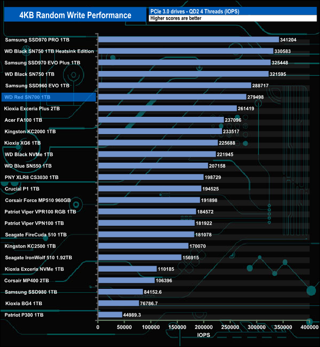 The drive holds its position in our random write results charts at the lower queue depths (1-4) before losing ground on drives around it at QD32 at the end of the test run.