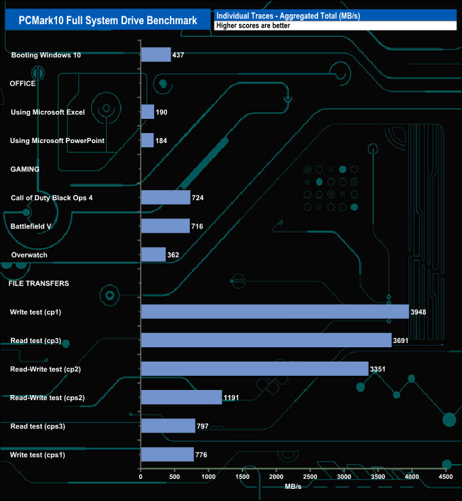 For the three gaming tests, the drive averaged 600MB/s with the fastest being the Call Of Duty Black Ops 4 trace at 724MB/s. The file transfer tests also produced a good cp1 (write test) figure of 3,948MB/s backed up by 3,691MB/s for the cp3 (read test) and 3,351MB/s for the cp2 read/write test traces.