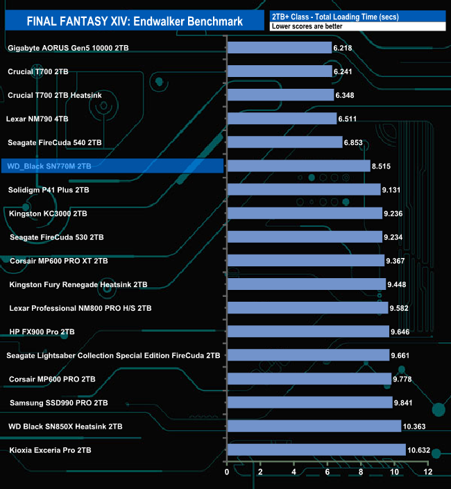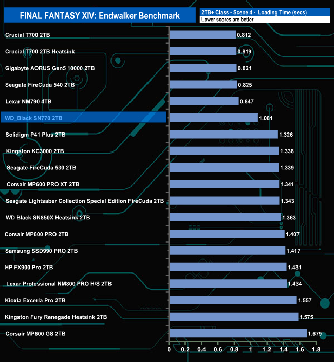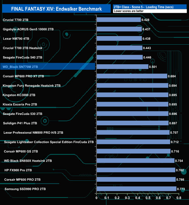 WD's Black SN770M does well enough in the Final Fantasy XIV Endwalker Official Benchmark. It doesn't top any of the scene load times, indeed for scene 1 it's very nearly the slowest drive, but it still manages to end up in the top 10 drives we tested with this benchmark.