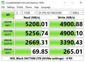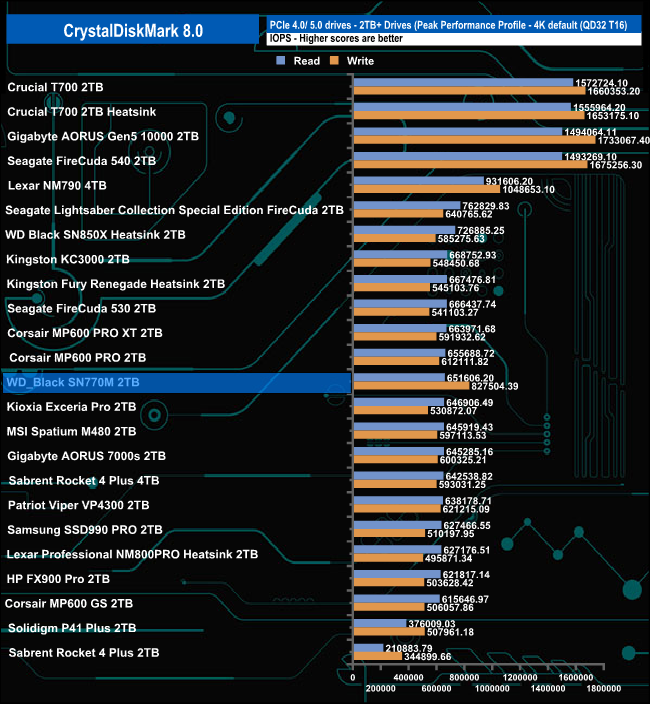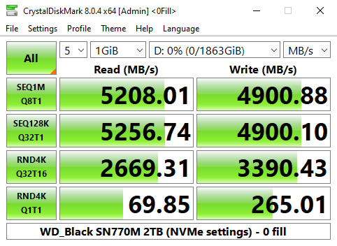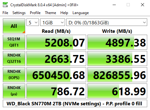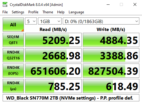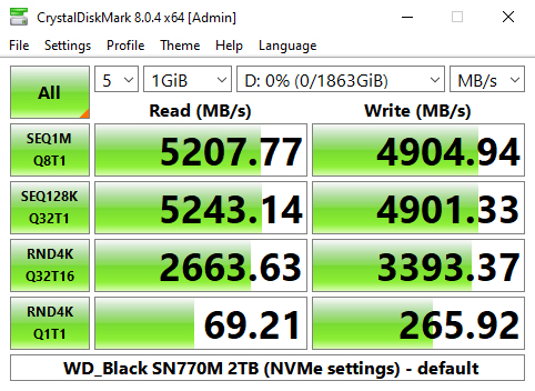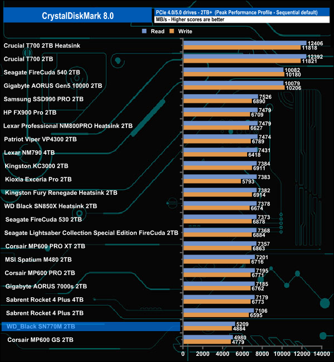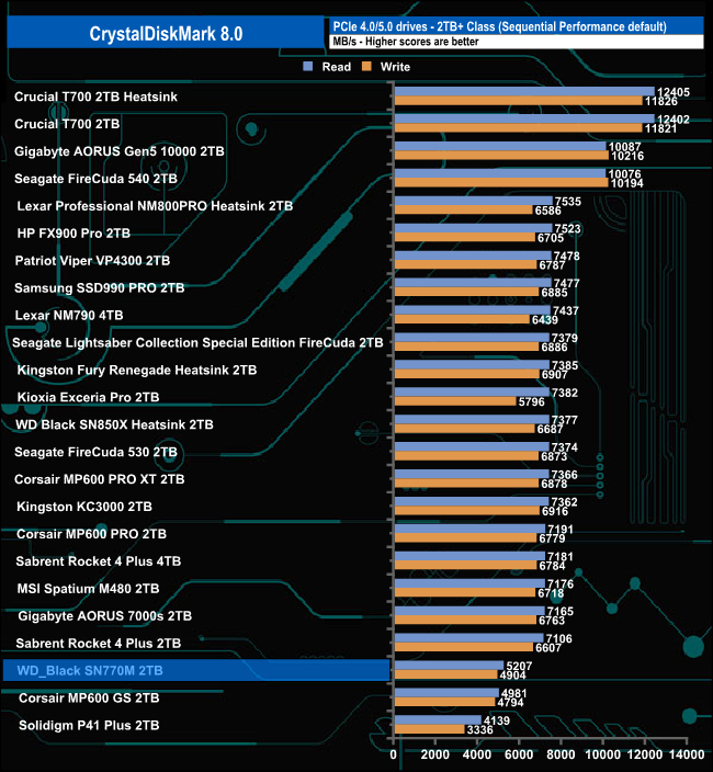 Those Sequential read/write result figures of 5,207.77MB/s and 4,904.94MB respectively puts the WD_Black SN770M firmly in the lower half of the results table.