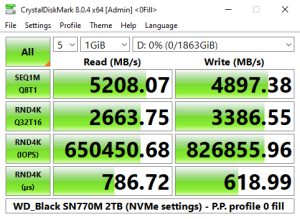 As you can see from the benchmark results screen we can confirm the official maximum Sequential read/write speeds (5,150MB/s and 4,850MB/s respectively) with a read test result of 5,207.77MB/s and 4,904.94MB/s for writes.