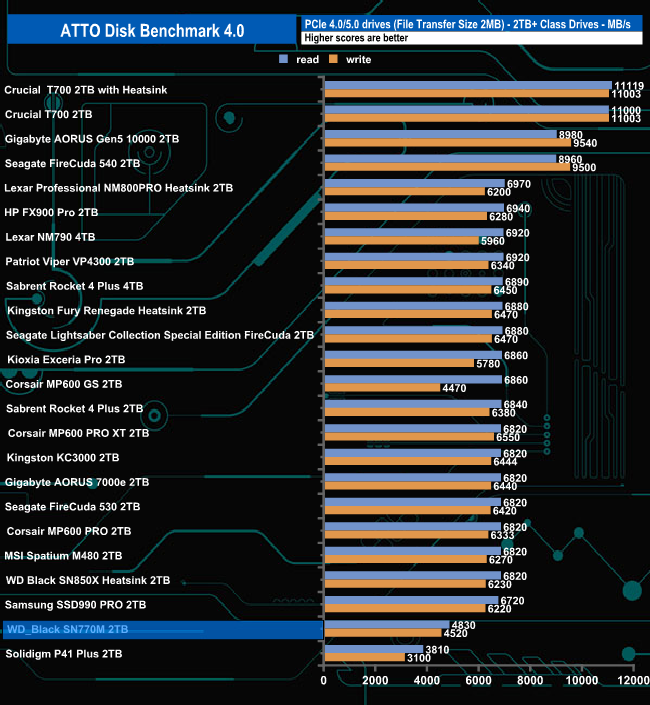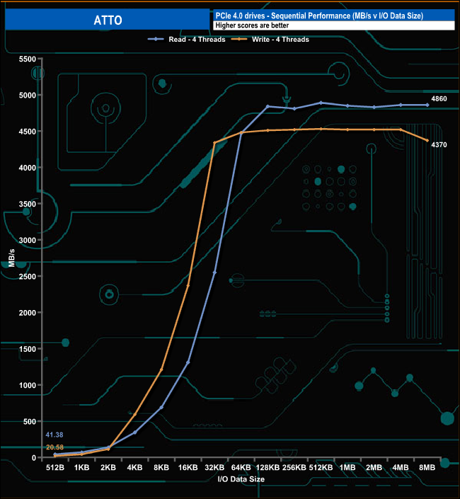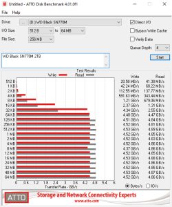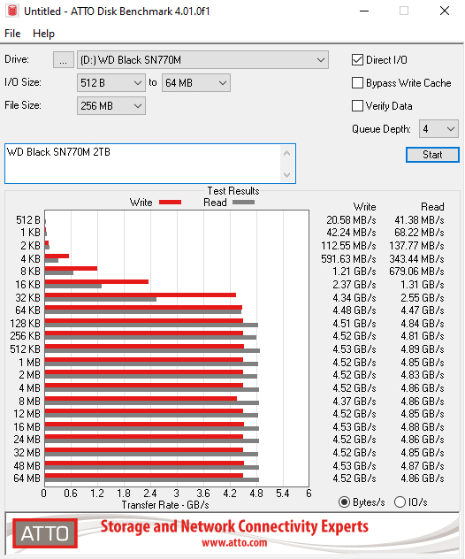 WD rates the Sequential performance of the drive as up to 5,150MB/s and 4,850MB/s for read/writes respectively. With the ATTO benchmark, we couldn't quite hit the official maximums with test results of 4,830MB/s for reads and 4,520MB/s for writes.