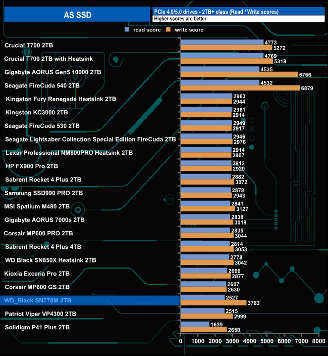 Using the AS SSD benchmark the drive's read score of 2527 sees it near the bottom of the results chart. However, its write score of 3783 is the fifth best we've seen from a consumer Gen 4 drive to date.